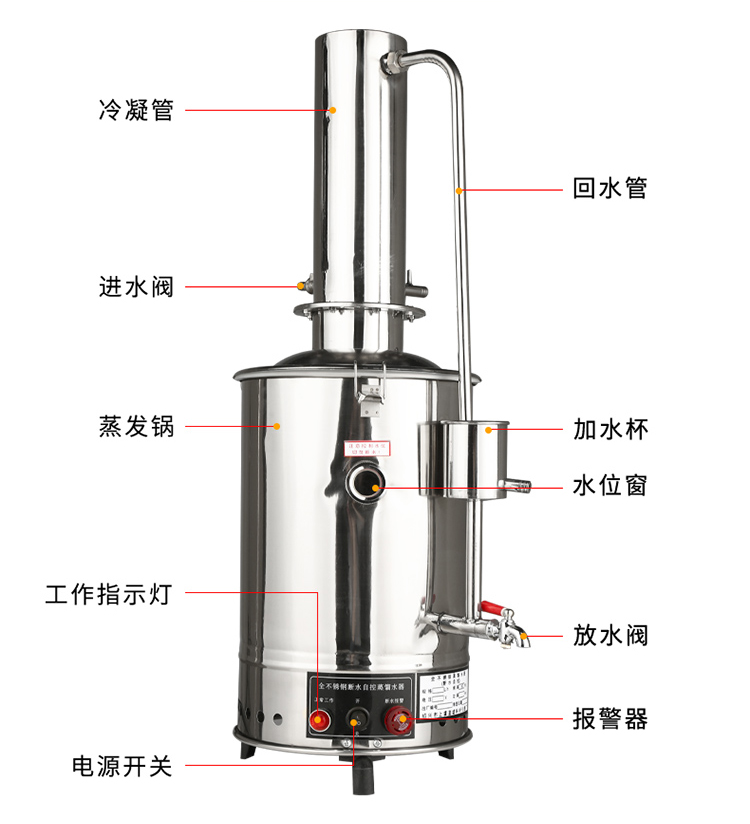 不銹鋼蒸餾水器用電加熱飲用自來水,以蒸餾方法制取純水,可供醫(yī)療衛(wèi)生、制藥、電鍍以及實(shí)驗(yàn)室等部門使用。該產(chǎn)品使用方便,操作簡單,更具特色的采用優(yōu)質(zhì)進(jìn)口不銹鋼材料、經(jīng)過特殊處理,精心加工而成。不僅充分保證了蒸餾水的質(zhì)量,而且也大大提高了使用壽命。 本產(chǎn)品主要由不銹鋼蒸發(fā)鍋、冷凝器、電氣裝置三部分組成。